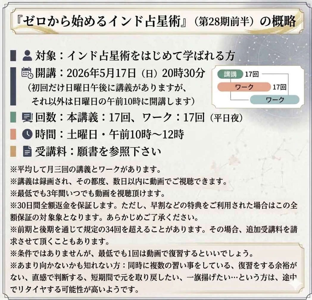 ※2024年9月に開講し2025年7月に終了した26期では、およそ120時間におよぶ講義(本講義とワーク)と動画コンテンツを12ヵ月間(全36回)にかけて消化しました。それが「長すぎてうんざりした」という受講生はおらず、むしろ「長いようで短かった」「インド占星術面白すぎます!」という感想を頂いています。