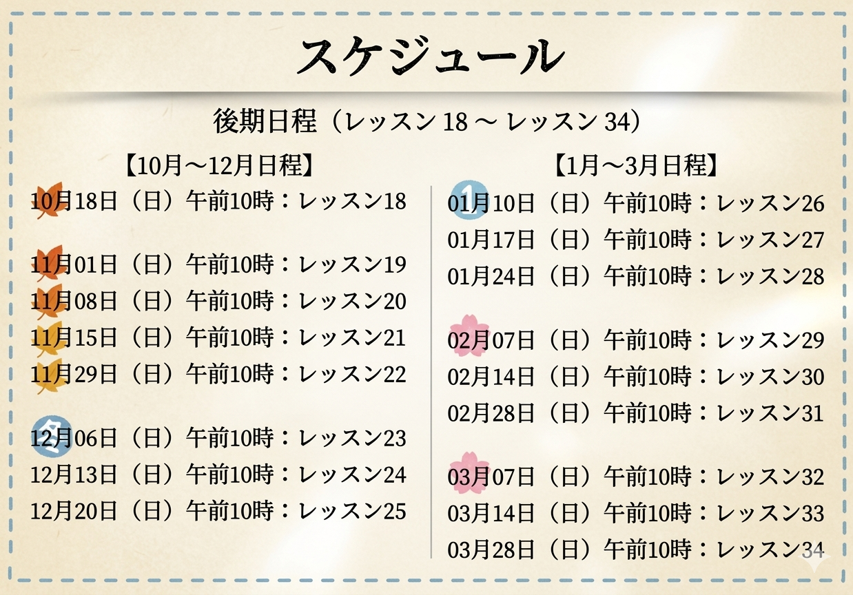 後半の日程(レッスン18からレッスン34まで)は以下の通りです。