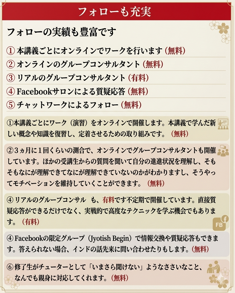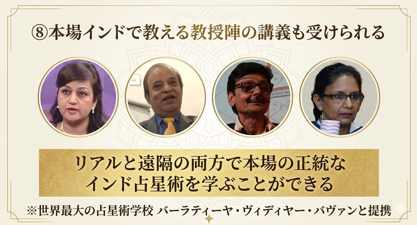 内容が正統:講師を務める清水俊介が、世界的なインド占星術の泰斗KNラオに師事し学んだインド占星術をお教えします。これ以上正統で本物のインド占星術はありません。添加物や不純物(ねつ造・偽造)は一切ありません。純正のインド占星術をお届けします。