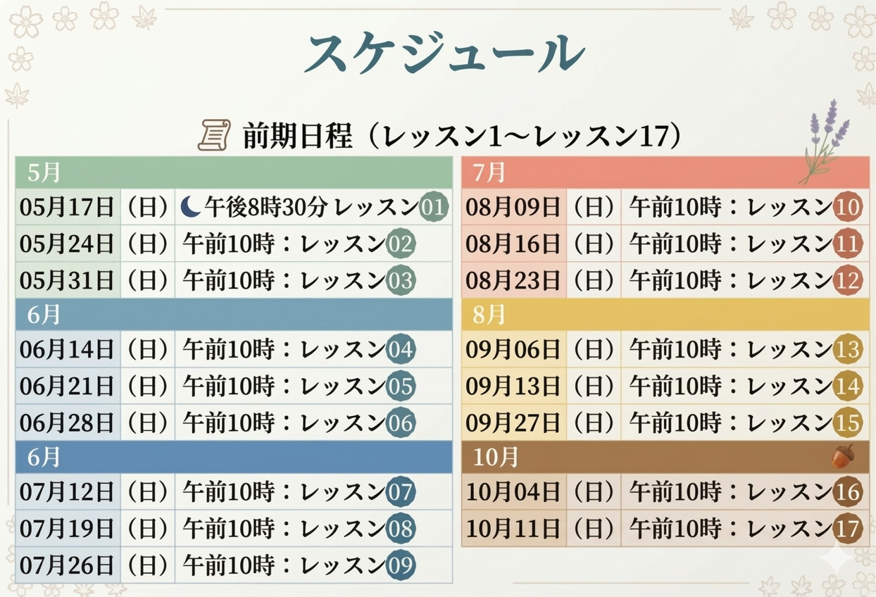 28期の前半の日程(レッスン1からレッスン17まで)は以下の通りです。