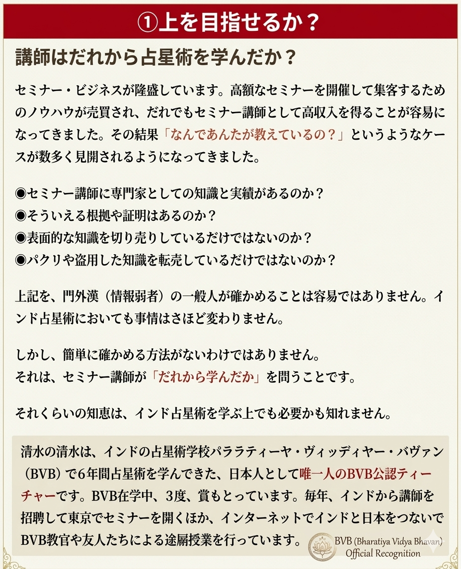 手段が正当(正式):講師清水俊介は、世界最大の規模と最高の水準を誇るバーラティーヤ・ヴィディヤー・バヴァンの占星術コースに2009年から2014年までの6年間正式に在籍しインド占星術を習得しました。
