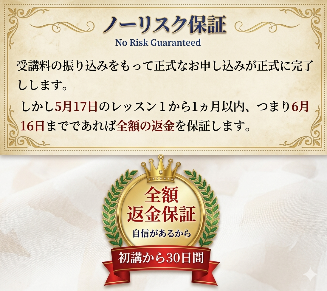 A4:はい、リタイヤはいつでもご自由ですが、「30日間全額返金保証」を適用して受講料の返金に応じられるのは最初の30日間だけです。ですので最初の30日間にコースを継続するかどうかを決めてください。また、「早割」の特典を適用して支払われた場合、大幅な割引が適用されるぶん、その後30日間以内であってもの受講料の返却のご依頼には応じかねますのでご注意ください。